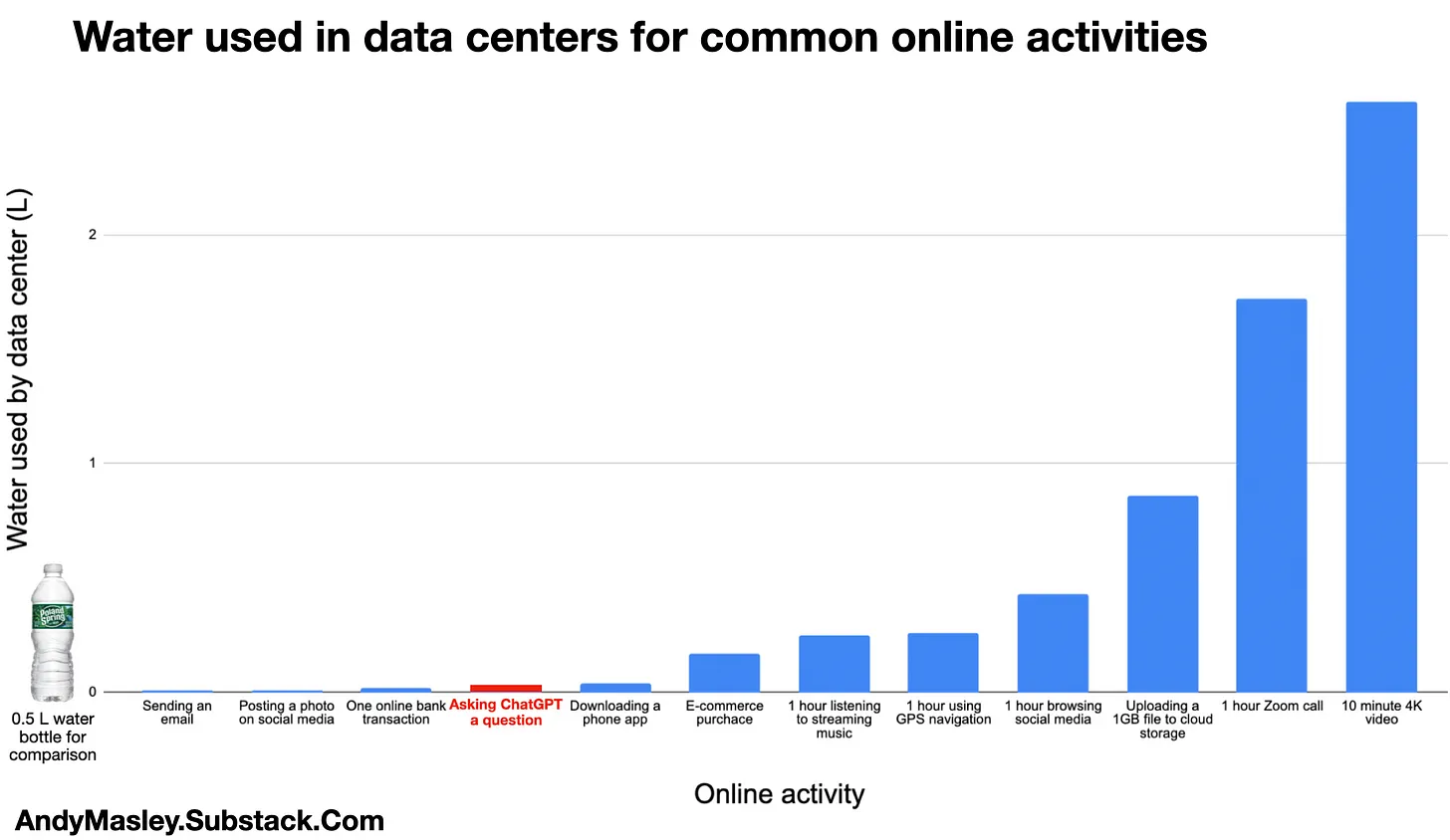 • Water Consumption: Data centers consume an estimated 1.7 to 2 liters of water per kilowatt-hour of energy used